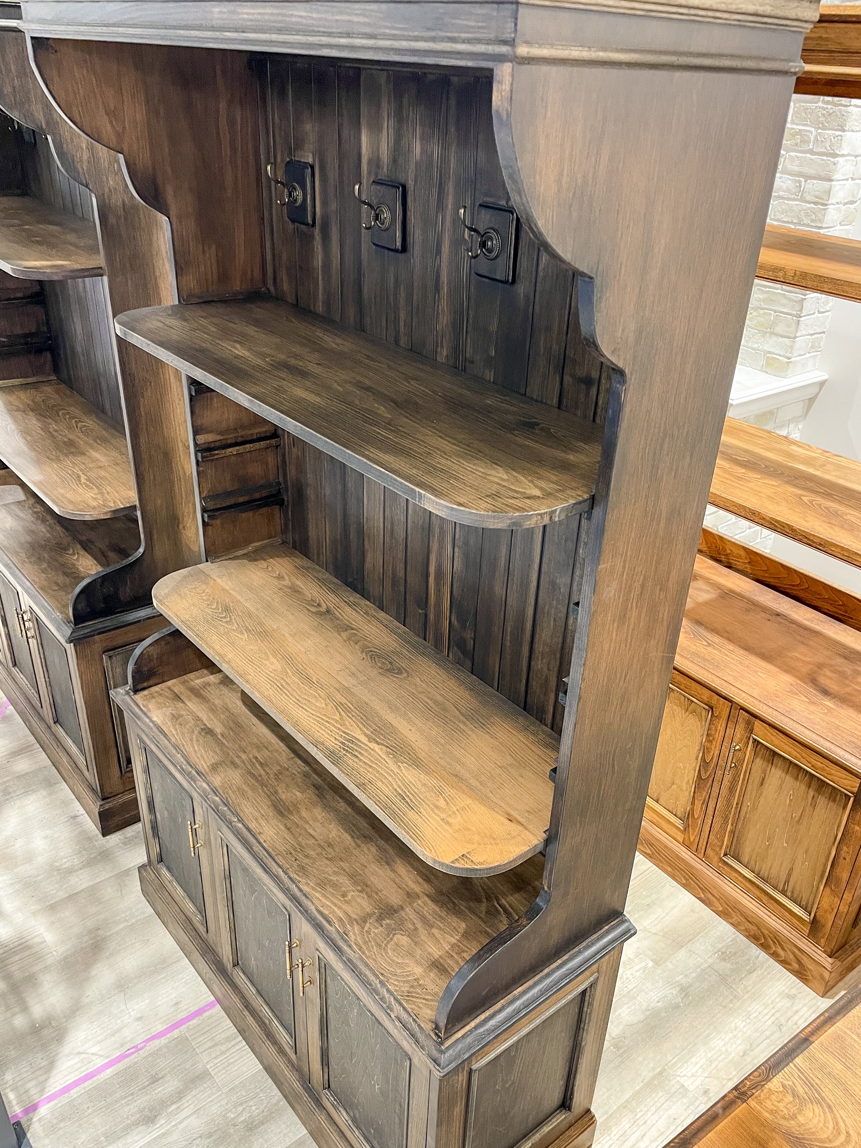 側面や棚板に曲面カットをたくさん施して、レトロアンティーク感を表現しました。写真の特注色「OSエボ二ー」他、他21色の基本カラーからもお選びいただけます。真鍮製の取手は100種類以上のデザインから選べるので、あなたの個性をキラリと光らせて下さい。オーダー家具の製作実績は3500件以上、熟練の家具職人が一点一点手作りいたします。ご新築やお引越し、お店のオープンに、アンティーク調家具のオーダーメイドはグレイスファニチャーにお任せください。