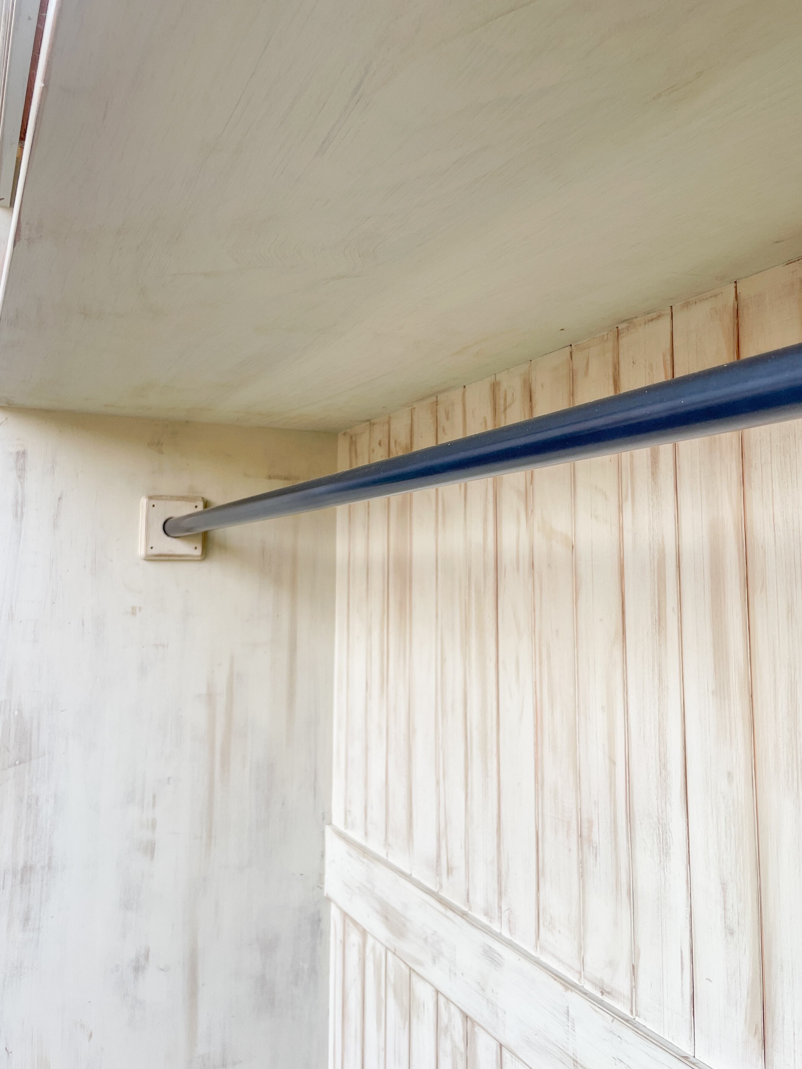 写真のサイズはW1500×H2100mm、サイズオーダー対応いたします。ハンガーポールの上には棚が一段。無垢材を使い、重ね塗りと剥離を繰り返して使い古したアンティーク家具のような雰囲気を表現しました。写真は特注色「ピクチャーフレームカラー」、その他21色の基本カラーから選べます。