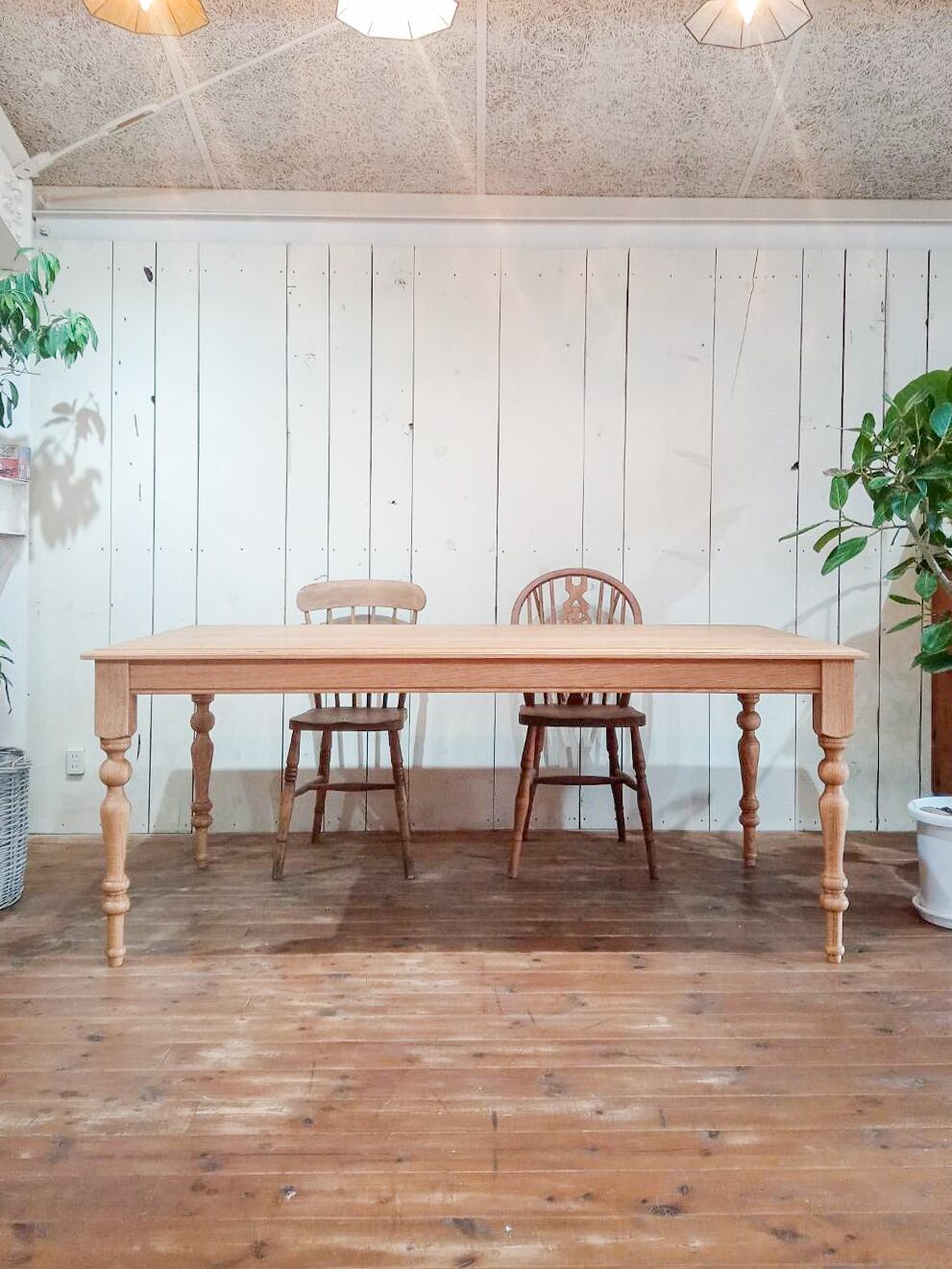 写真のサイズはW1800✕D800mm、片側に椅子が3脚並ぶ6人がけサイズ。高さ750と少し高めの設定で、アンティークチェアや輸入チェアに合わせる高さ。一点一点オーダーメイドで製作しておりますので、細かなサイズオーダー対応致します。
