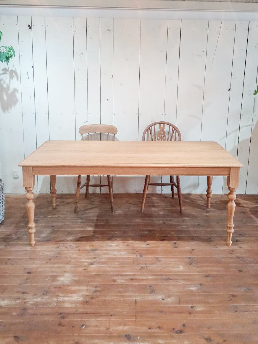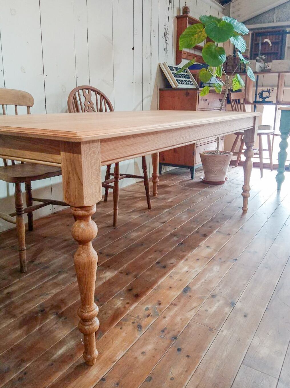 人気の木材ホワイトオークだけで作るアンティーク調ダイニングテーブル。繊細で緻密な木目がホワイトオーク材の特徴、固く丈夫で古くから高級家具の材料として人気です。シンプルでいて美しいシルエットのろくろ脚ダイニングテーブルの専門店です。