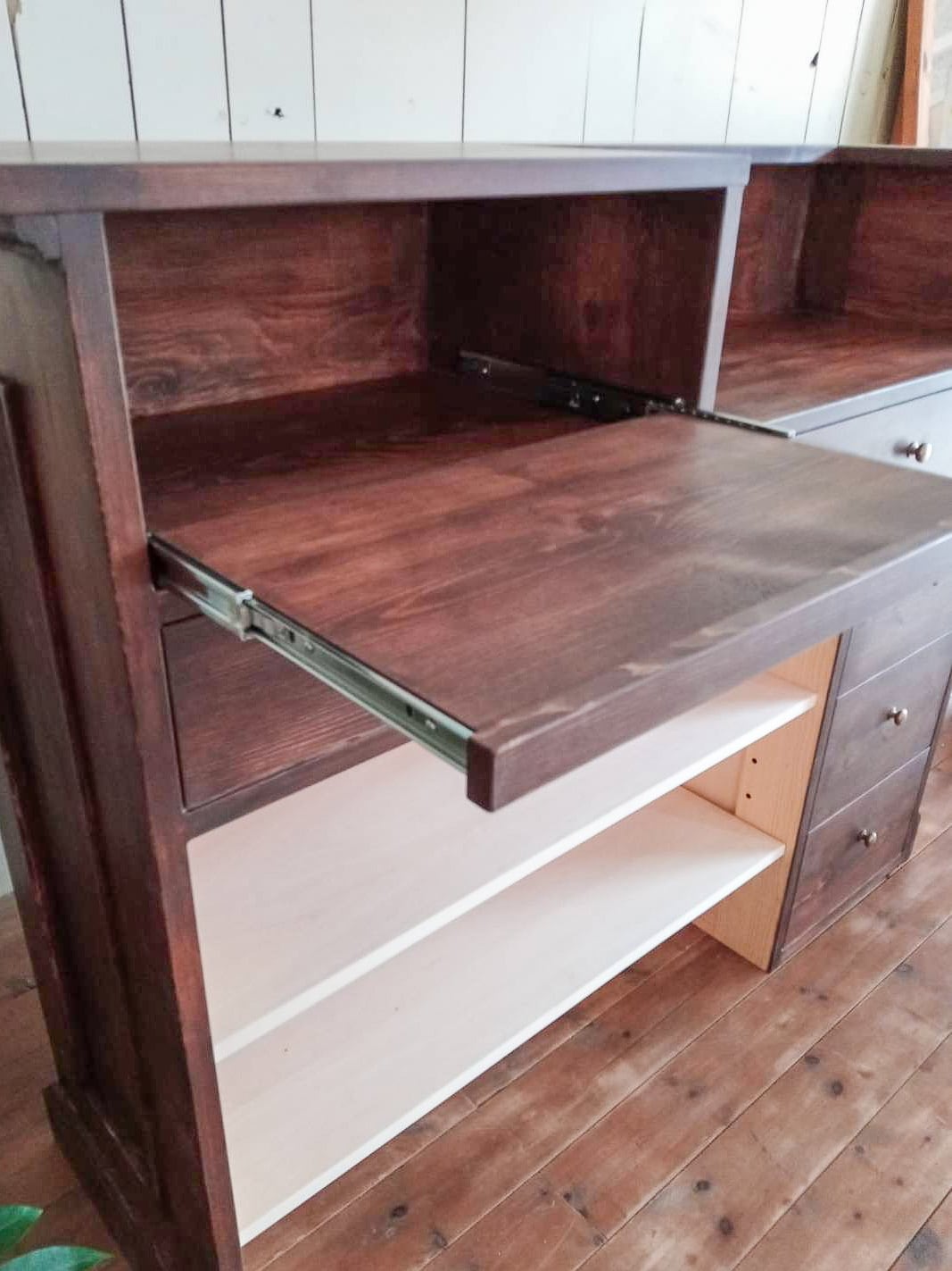 写真は横幅1300、高さ1100mm、定番より少し背が高く手元を十分に隠せるサイズ。内側の収納は業務に応じて自由にカスタマイズできます。写真では凹んだ作業テーブル、スライドテーブル、引出し、可動棚と多彩な機能。貴店ならではの都合をお聞かせ下さい。