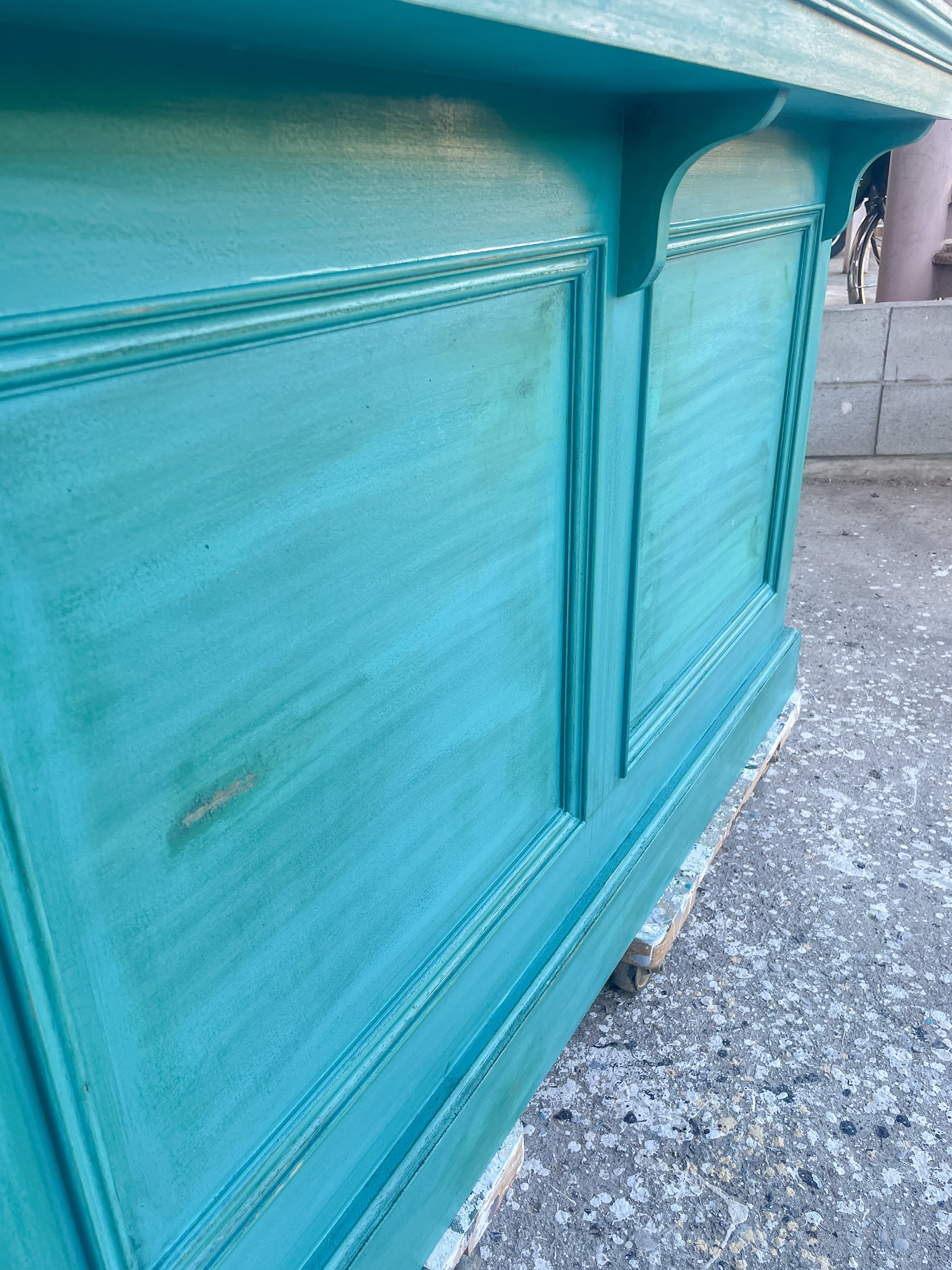 写真はW1300✕D1200mmのL字型受付カウンター。内側が見えにくく、お店スペースの間仕切りにも役立ちます。モールディングで立体的に装飾し、塗装が剥がれたエイジングペイントを施したアンティーク家具風カウンターです。基本カラーは13色ですが、 写真のようにカラーオーダーも可能です。