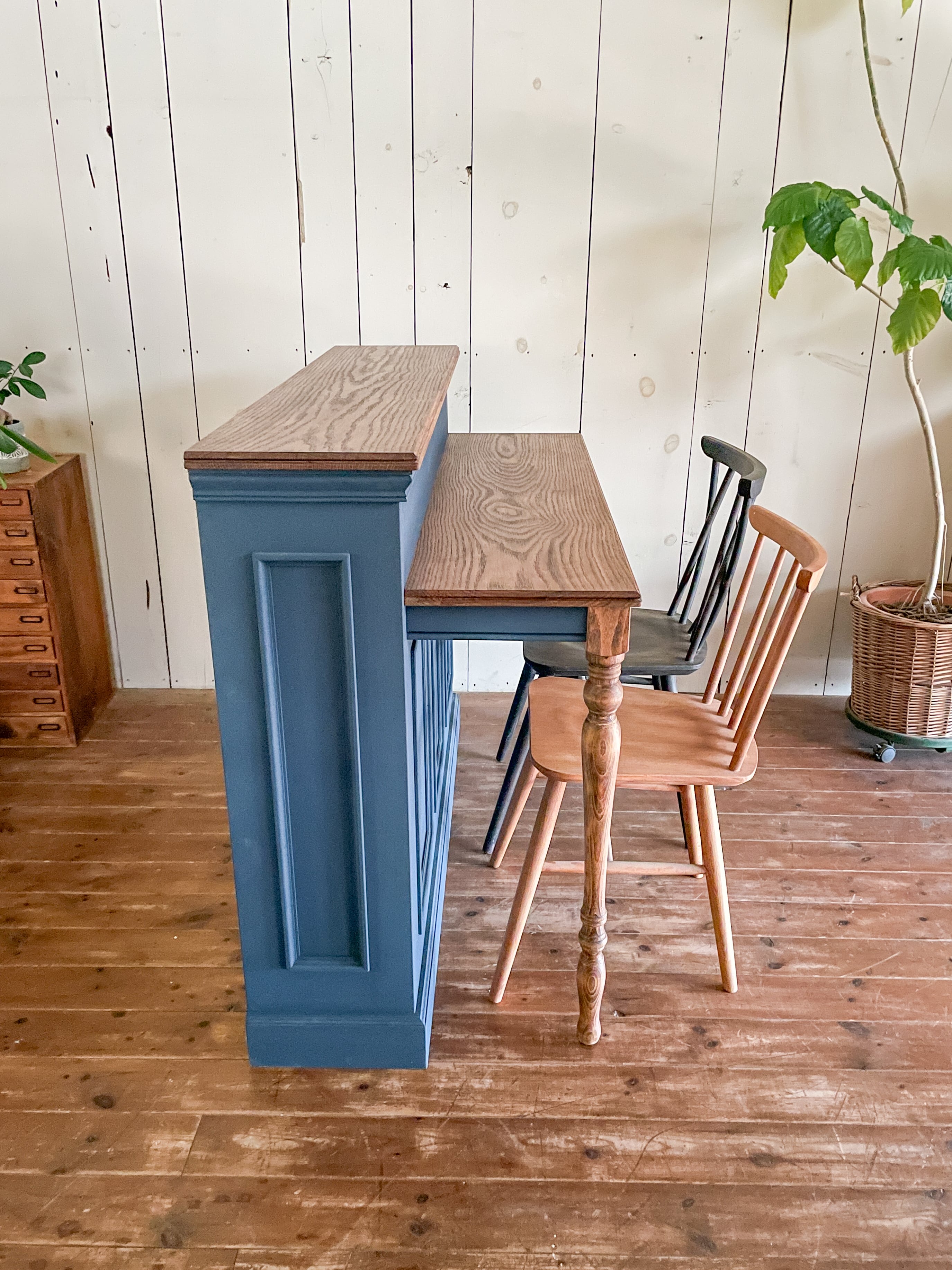 写真はW1300、D570、高さ1000、カウンターテーブル高さは800mm、細かなサイズオーダー対応致します。写真の内側はオープンに製作しております、ご希望に応じて引出しや可動棚、扉収納の設置が可能です。あなたのご要望に応じた、オリジナルの家具を製作いたします。