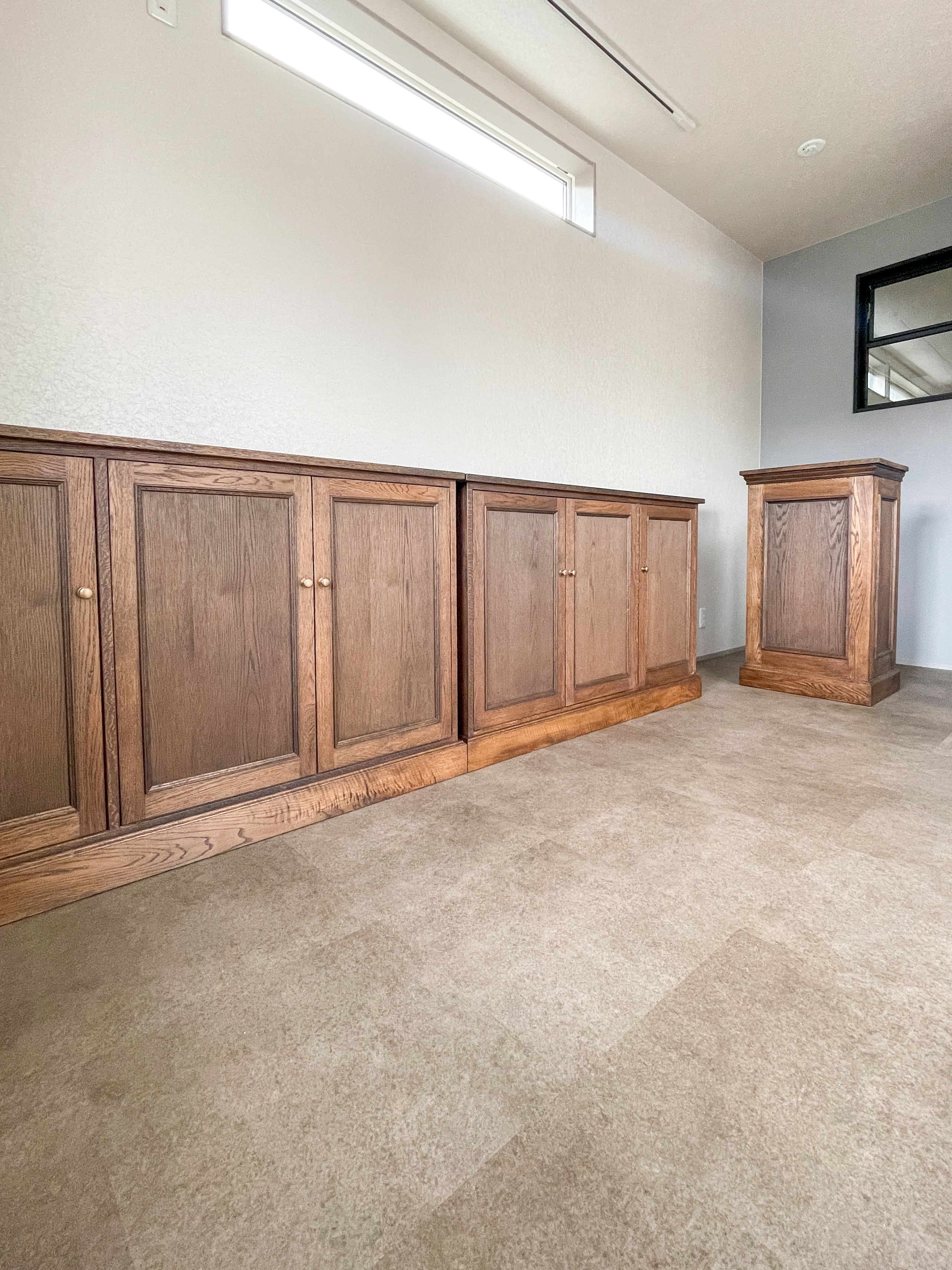 滋賀県にオープンするお花屋さんに、総幅2800mmの大きなキャビネットを納品させていただきました。クラシックアンティーク調デザインのオークキャビネット。要所要所にモールディング装飾を施した、高級感漂うオーク家具です。オーク材を使ったオーダーメイド家具の製作はお気軽にご相談下さいませ。